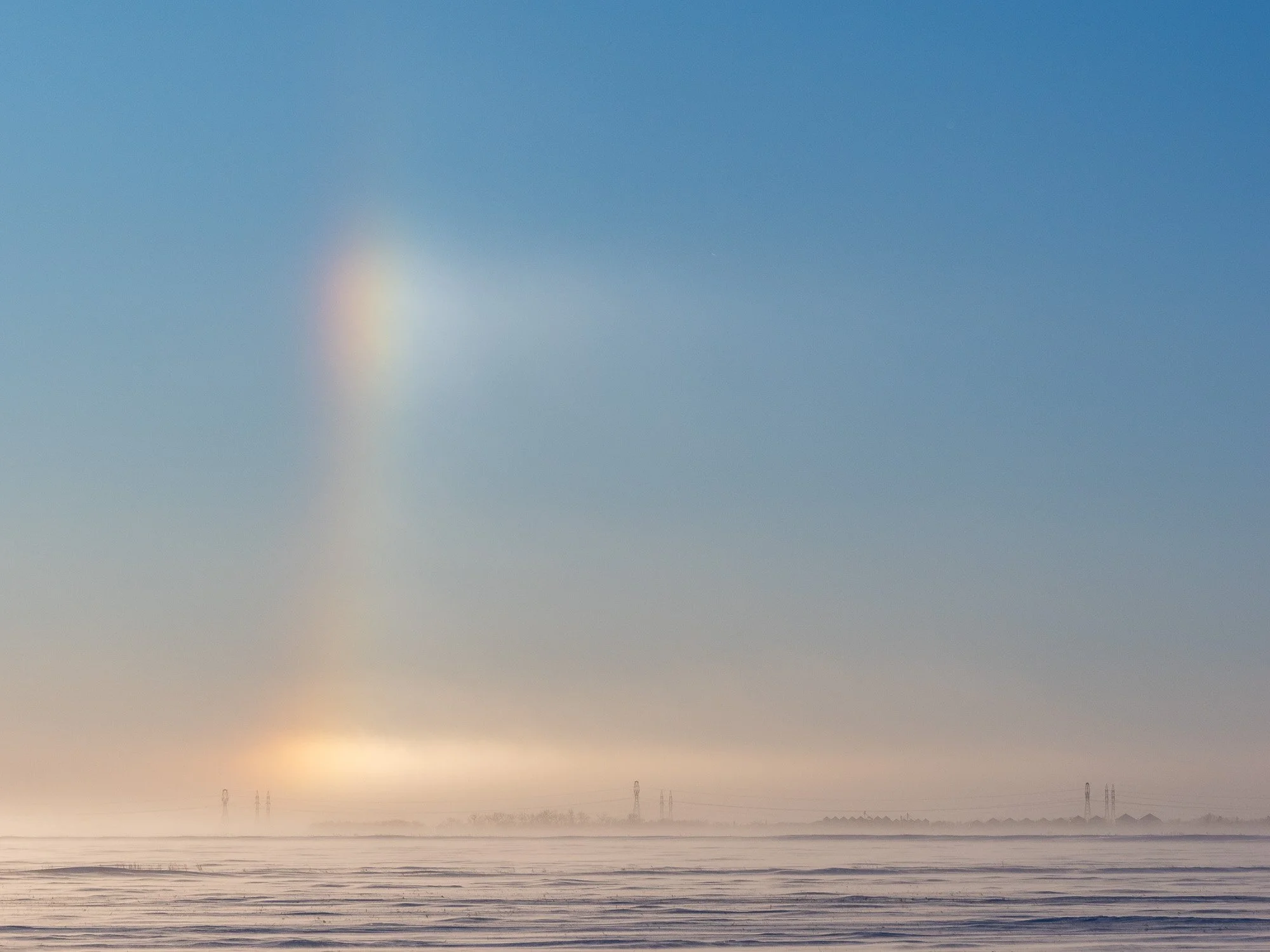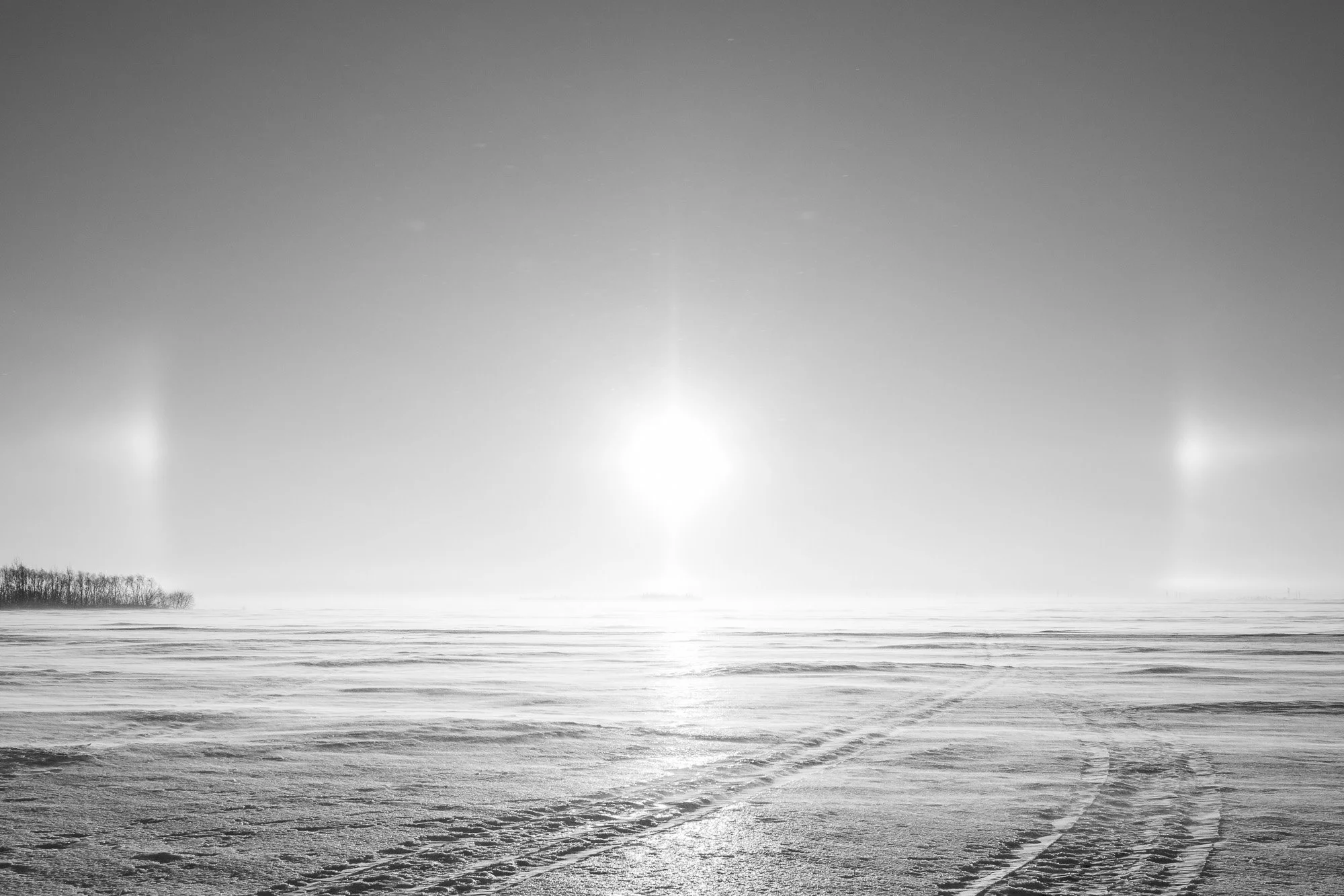 Anyway, the blowing snow scoured the open fields, and really made the sun dogs glow:
