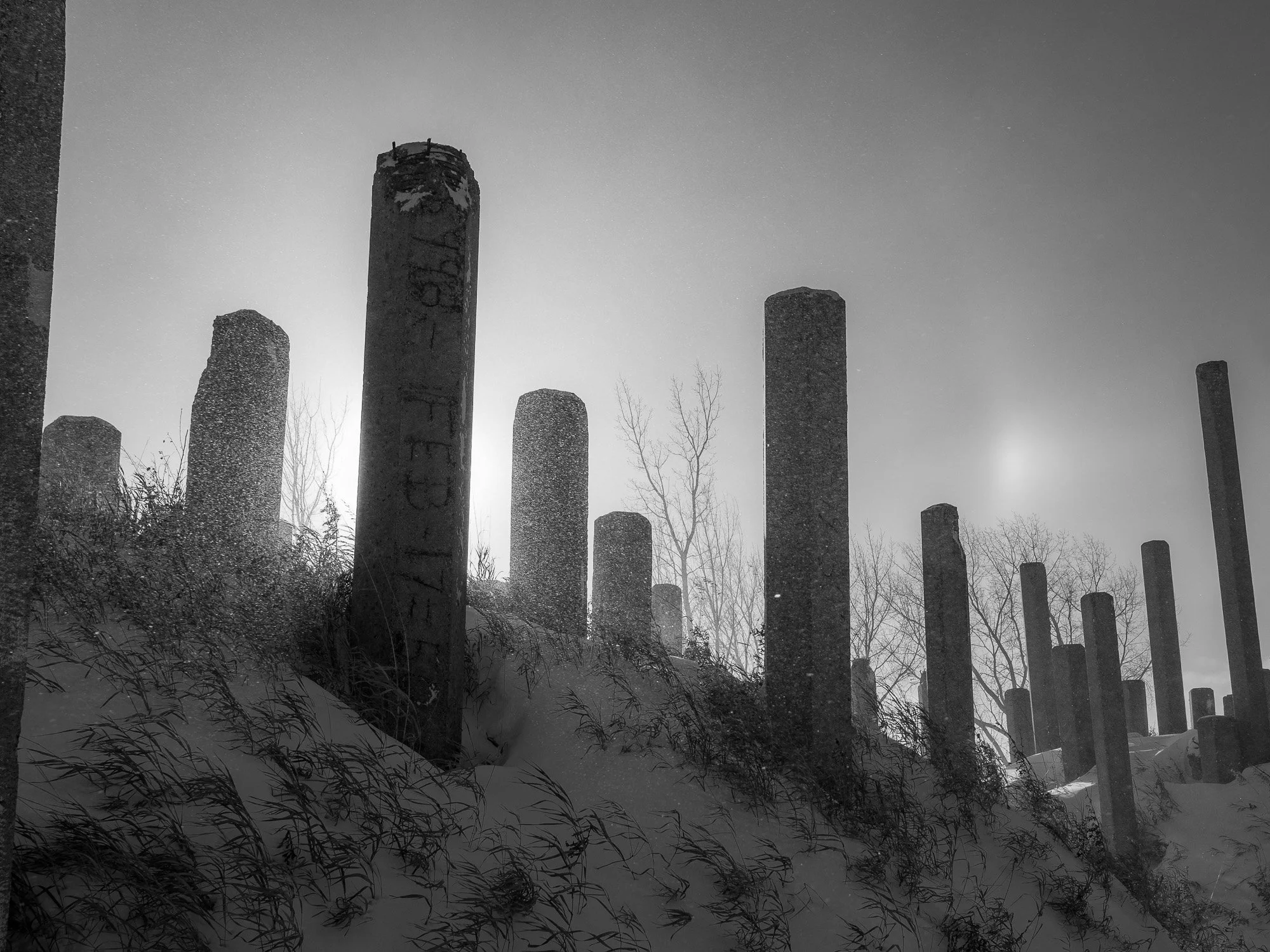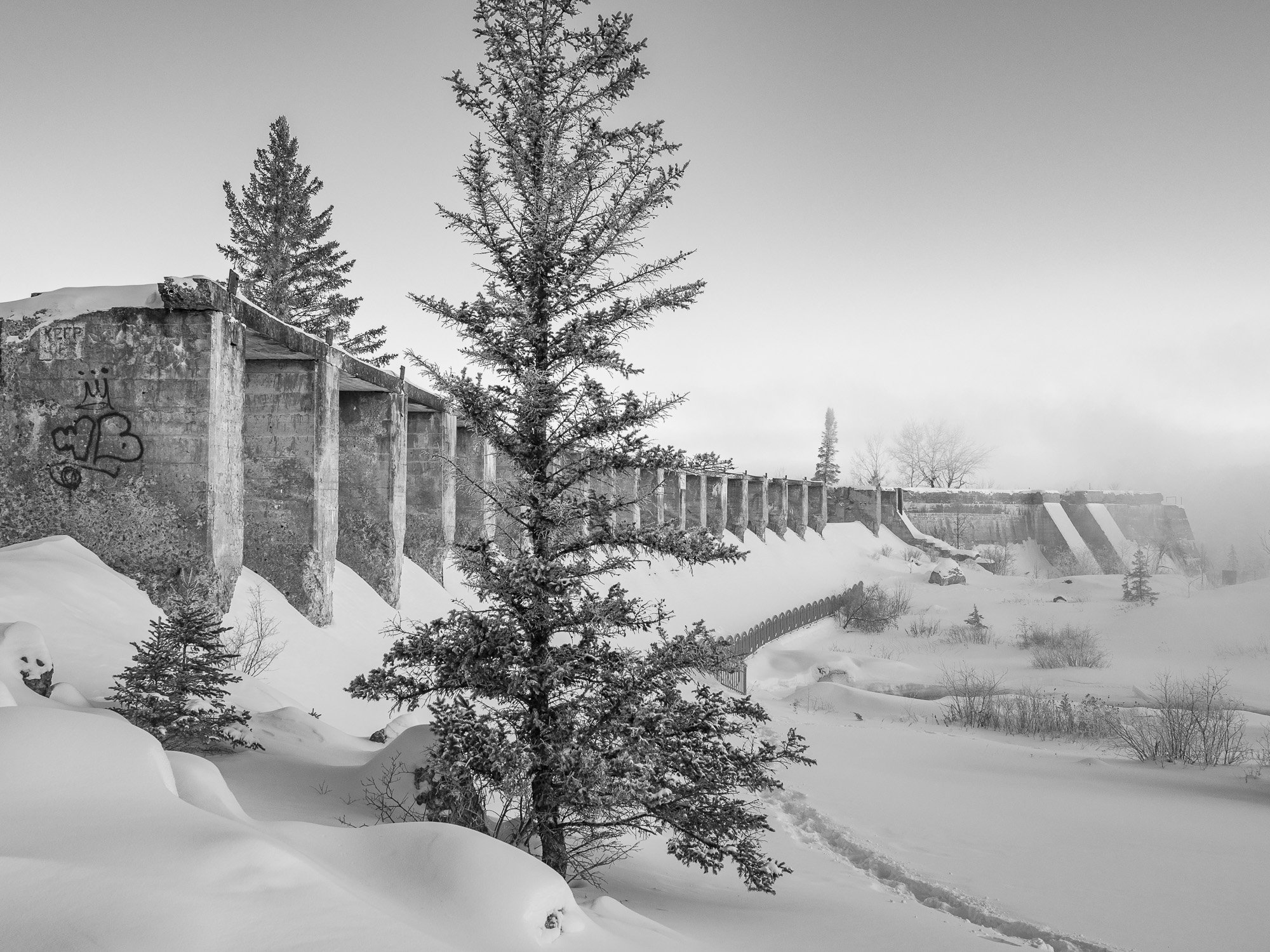 Anyway, I decided to return to Pinawa Dam, to bask in the humidity around the river and old dam ruins. Just as the sun was rising I caught this shot, presented in black and white because, between the river mist and general haze, the colours were extremely muted: